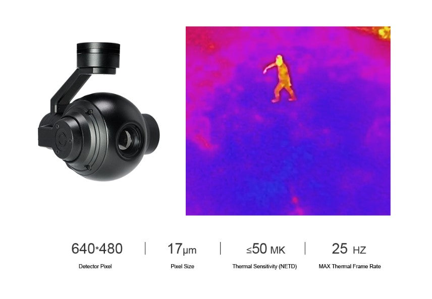 El QIR19 cuenta con una cámara termográfica con lente de 19 mm, admite píxeles de detector de 640 * 480, zoom digital de 1x ~ 4x. El cardán se puede controlar en tres direcciones: GUIÑADA, BALANCEO y CABECEO , utilizamos la solución FOC que puede compensar en gran medida la vibración del UAV. Todos los parámetros se han configurado perfectamente, solo necesita instalar la cámara cardán en el UAV y luego estar listo para volar.